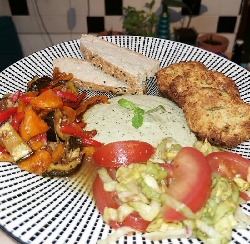 - Dazu gibt es Tomaten, Eisbergsalat, Paprika, Zucchini mit Knoblauch, Fladenbrot und einen Dip aus Mandeln, Pistazien und Kräutern🧄