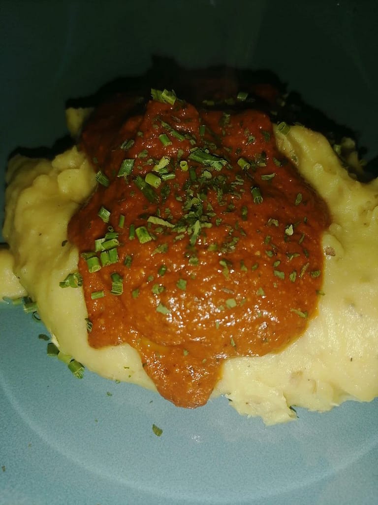 - Kartoffeln weich kochen. In der Zwischenzeit eine Handvoll Cashewkerne mit Salz, Pfeffer und Hefeflocken in einem Mixer mit Wasser zu einer Pflanzenmilch verrühren. Kartoffeln mit der hergestellten Pflanzenmilch und etwas zusätzlichem Salz fein pürieren oder in eine Kartoffelpresse geben.