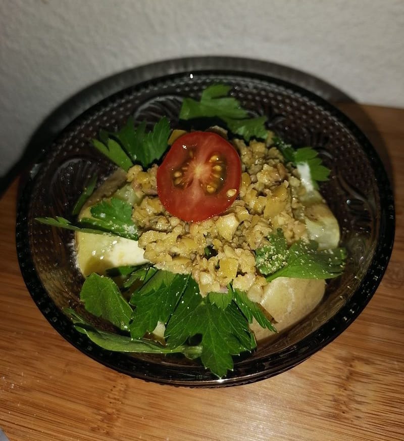 - Gekochte Kartoffeln andrücken, Salz und Pfeffer, Butter und Petersilie, am Schluss gehackte Oliven und Knoblauch darüber geben😍