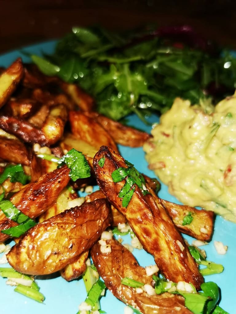 Knoblauch-Kartoffeln und Guacamole-Plus-Salat 🤤