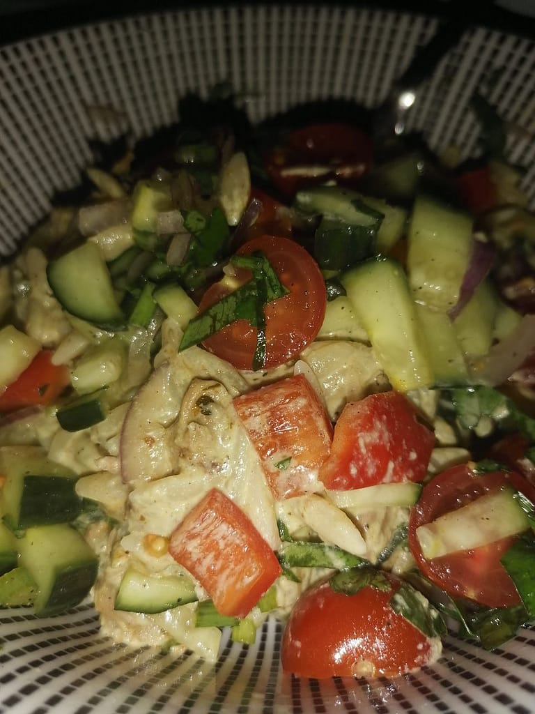 - Nudeln kochen, wenn sie leicht abgekühlt sind, Soße unterheben, den Salat darüber geben und servieren.