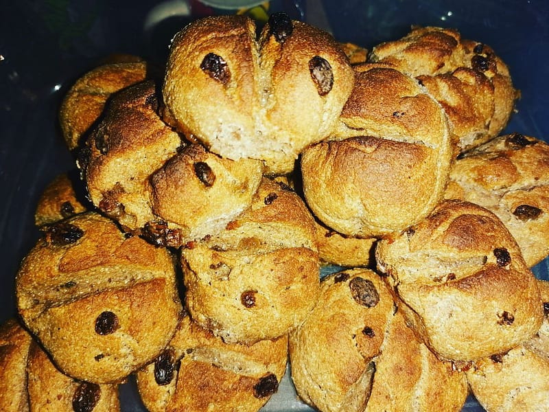 - Rosinen in den Teig kneten und kleine Brötchen formen, auf ein Blech geben und weitere 20 Minuten gehen lassen.